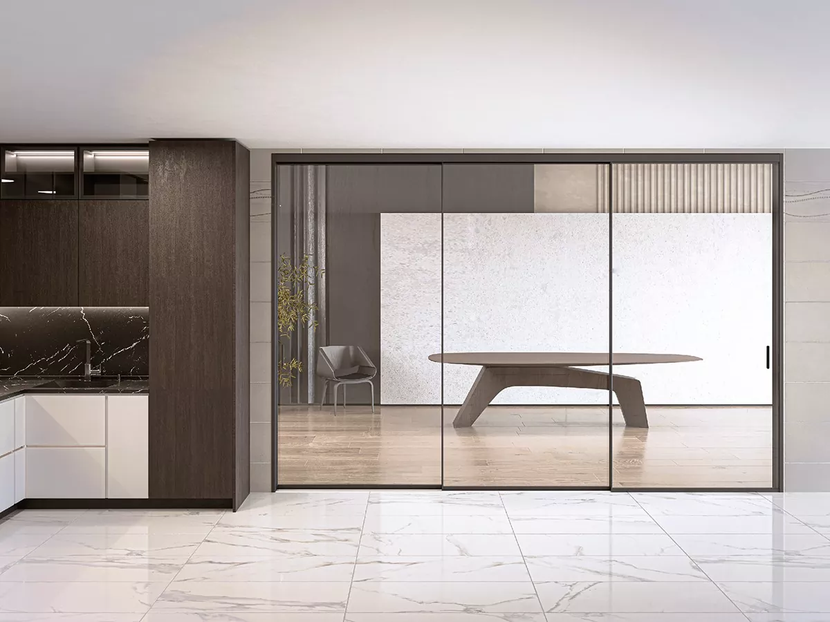 1. Desain sing gampang: lawang geser kaca sing gampang banget nggunakake sistem trek sing didhelikake utawa selendang kanggo nggawe lawang katon Neater. Desain iki biasane nggunakake bahan modern kayata kaca lan aloi kaca lan aluminium, sing bisa nambah lampu ruangan lan menehi efek visual sing mbukak.